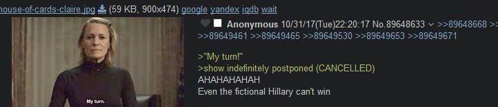 Во вторник должны были начаться съемки очередного эпизода шестого сезона «House of Cards», который из-за предательства Кевина Спейси пообещали сделать последним, но сценаристы, еще пока плохо натренированные на мгновенном переписывании сценария по требованию партии, не успели как-нибудь жестоко избавиться от главного героя в начале серии, поэтому Netflix, чтобы его в чем-нибудь не обвинили, просто решил прекратить этот сериал, не доведя его до логического завершения.